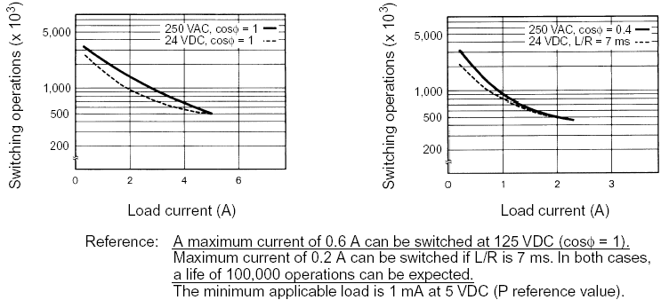 | Control output (Contact output) | Switching capacities (resistive load (cos (phi) = 1)): 250VAC 5A Minimum applicable load: 1 mA at 5 VDC (failure level: P) |