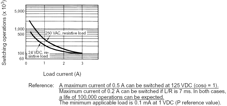 | Electrical life expectancy (relay output) | 100000 operations min. (3 A at 250 VAC, resistive load at 1800 operations/h) |
