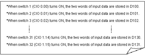 *When one of the pushbutton switches from 1 to 32 is pressed, the two words of input data (4-digit BCD data) will be stored in D100 to D131 as shown in the following example.