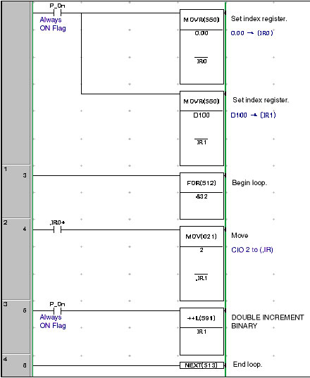 2.By using a NO input condition for the Always ON Flag (P_On) together with -- [++L IR1], the address in IR[] will be incremented for every scan of the FOR-NEXT loop.