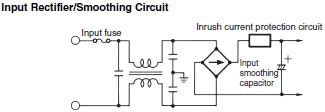 When a Switch-mode Power Supply is turned on, a surge of current flows into the input smoothing capacitor to charge the capacitor. This current surge is called the "inrush current." The inrush current varies depending on the application timing and the presence of an inrush current protection circuit, but is usually several to several tens of times greater than the steady-state input current.