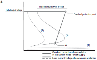 If more than one load with these characteristics is connected, the startup current will attempt to exceed the vertical line of the overcurrent protection characteristics of the Switch-mode Power Supply (as shown by (3) in Figure a). The current and voltage will stabilize at point A in the figure, and the rated output voltage will not be achieved.