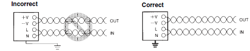 The damping effect of the noise filter built into the Power Supply will be reduced if a long ground wire is used. Always make ground wires as short and as thick as possible.