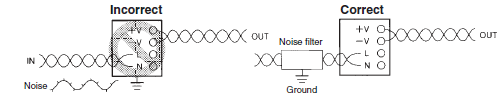 Include a noise filter on the input side of the Power Supply if faulty operation in electric circuits connected to the output from the Power Supply are being caused by sources of surge on the AC input line, such as large magnetic relays.