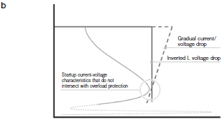 To prevent this, you need to select a Power Supply with a high enough capacity to supply the startup current, select a Power Supply with an inverted L voltage drop overcurrent protection characteristic that exceeds the startup current, or select a Power Supply with an gradual current/voltage drop for which the startup current-voltage characteristic of the DC-DC converter does not exceed the vertical drop characteristics of the overcurrent protection.