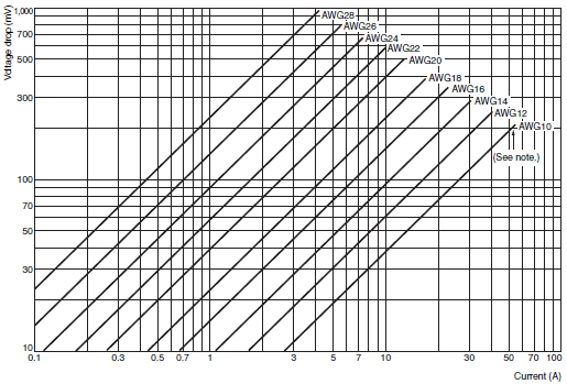 Current The table is applicable to wires with 1 to 4 conductors. Keep the Current value to within 80% of the values shown in this table when using wires having 5 or more conductors. The following chart shows the voltage drop per meter in terms of the relationship between the Current and conductor diameter. Make sure that the Current value does not exceed the recommended maximum Current value.