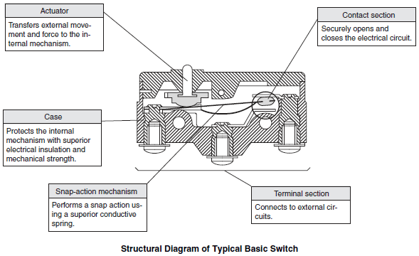 A Basic Switch is a small switch with a very small contact gap and snap-action mechanism and with a contact structure that switches for a specified movement and specified force enclosed in a case with an actuator provided on the exterior of the case.