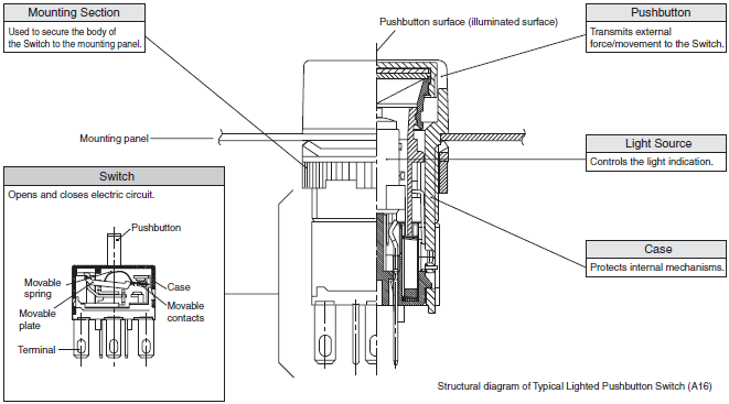 A Pushbutton Switch is a switch designed so that its contacts are opened and closed by depressing and releasing a pushbutton on the Switch in the direction of its axis. Pushbutton Switches come in two categories: lighted and non-lighted. The structure of a typical Lighted Pushbutton Switch is shown below. Broadly speaking, Lighted Pushbutton Switches are made up of the 5 sections shown below.