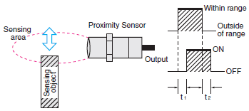 t1: The interval from the point when the standard sensing object moves into the sensing area and the Sensor activates, to the point when the output turns ON.