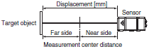 The X-axis displacement indicates the measurement distance displayed on the Amplifier Unit. The measurement distance displayed on the Amplifier Unit is 0 at the measurement center distance, positive when in the near side of the measurement range, and negative when in the far side of the measurement range.